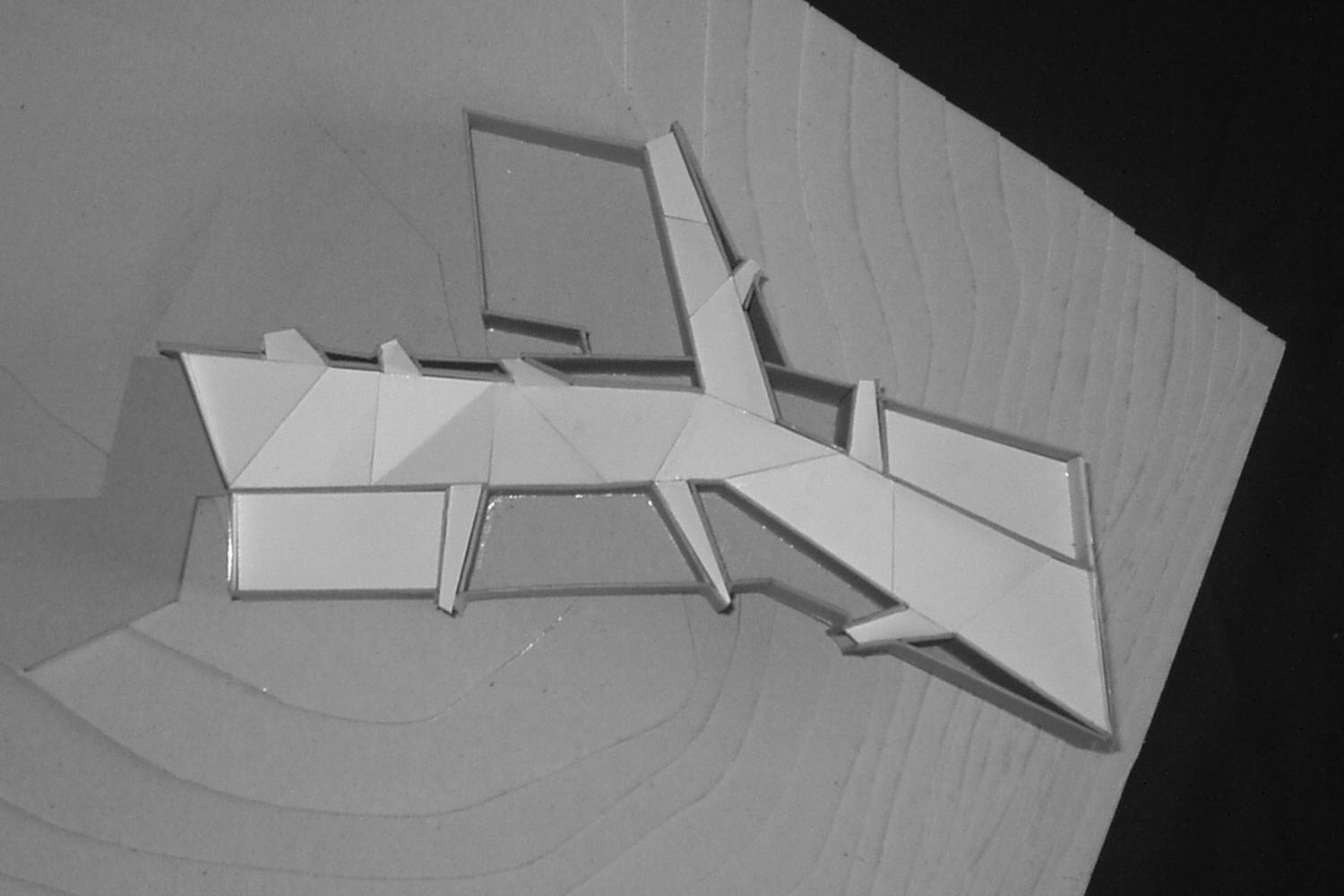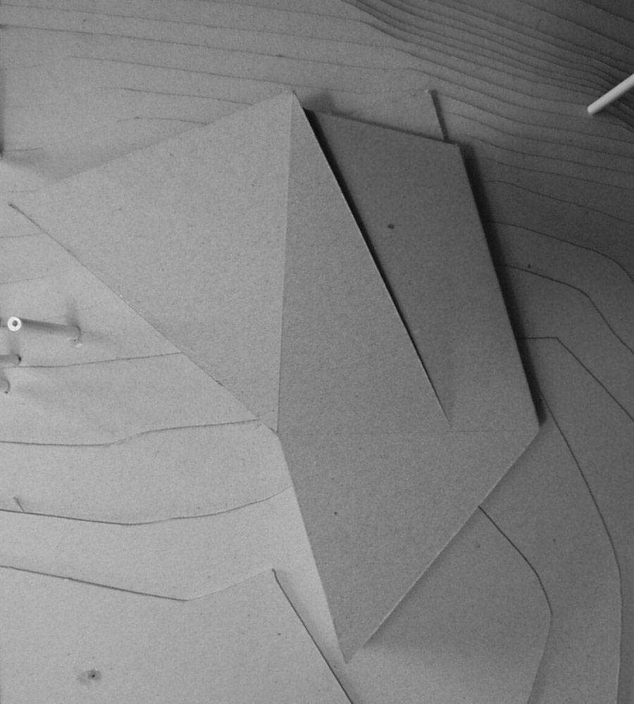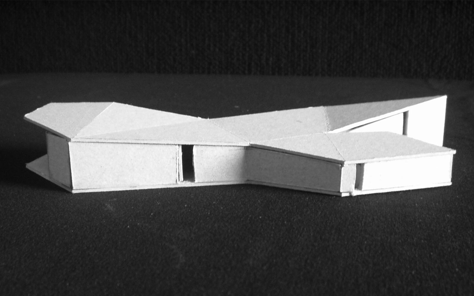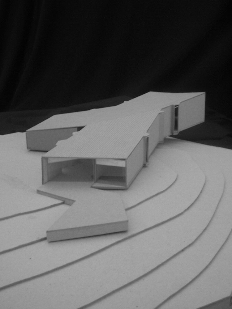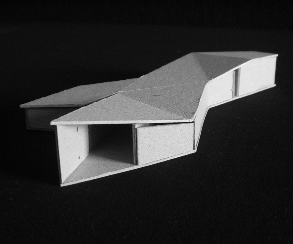 The blankness of the exterior is continued internally in the “public” spaces, furthering the idea of an uncanny container-like object in lieu of any semblance towards the “domestic”. The interior is in fact another exterior and equally “blunt” albeit the external tough metal cladding is replaced with a homogeneous ‘white’ surface. A crumpled ceiling expresses the force of the real (human arrival) and unreal (latent landscape line between mountain and view) vectors pushing in through the container-like internal space and fusing in to a singular projection to the distant water view; the ceiling profile relaxes as it approaches the culminating end space from where the views are experienced, similar to the effect of smoke travelling through a wind tunnel.