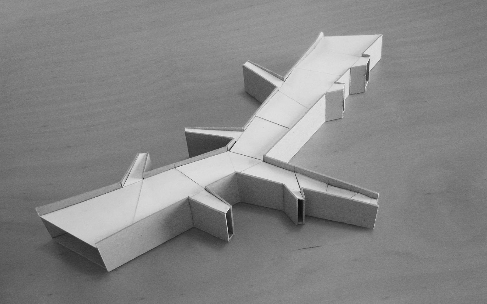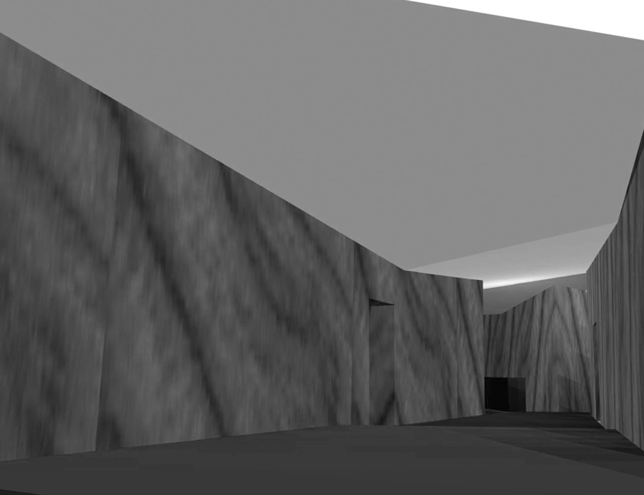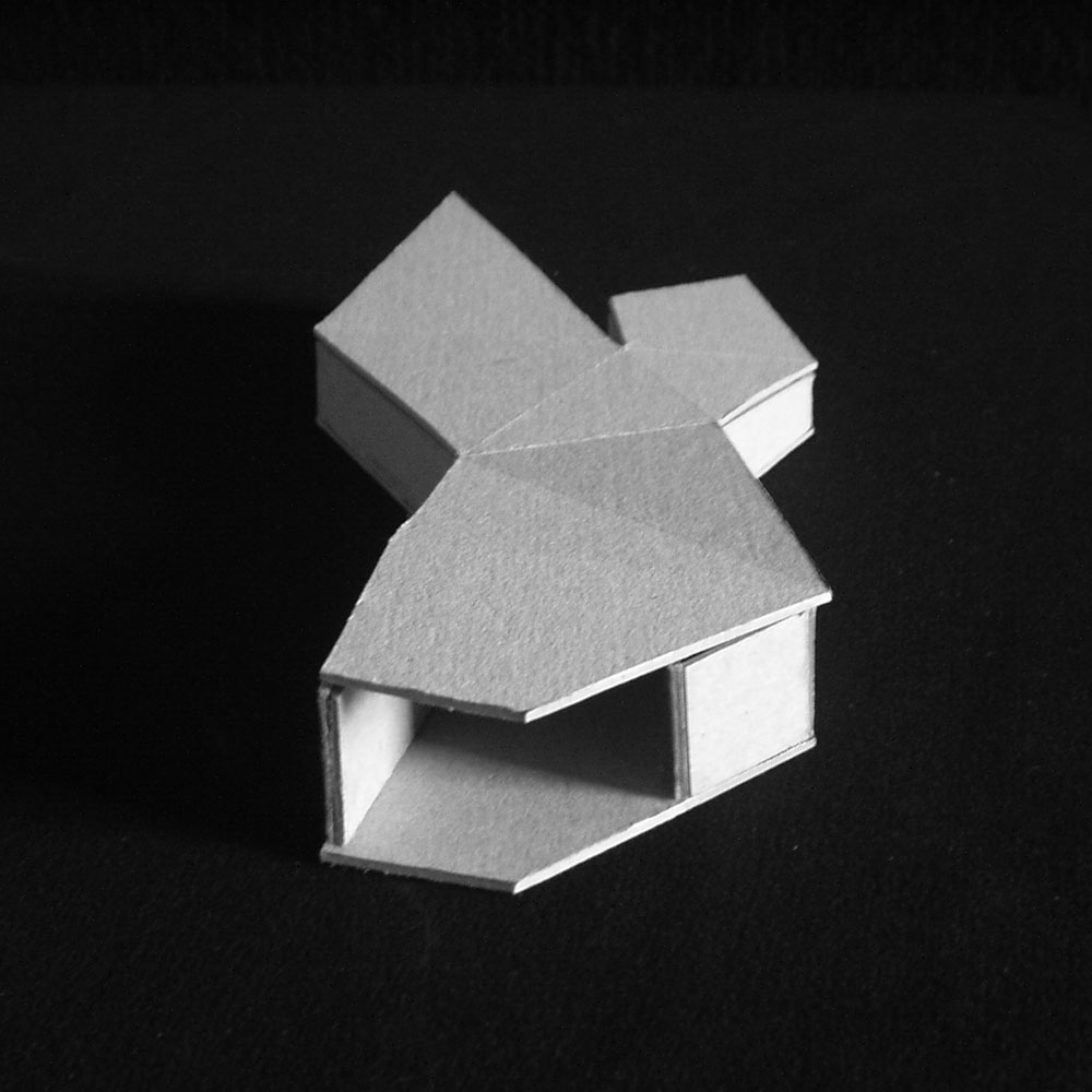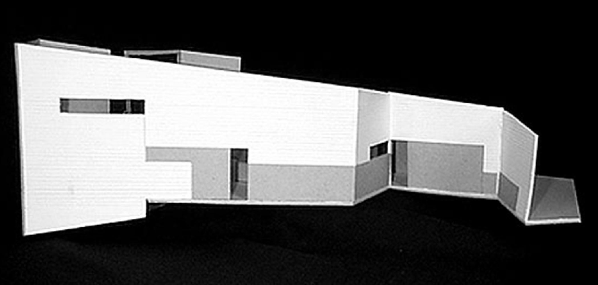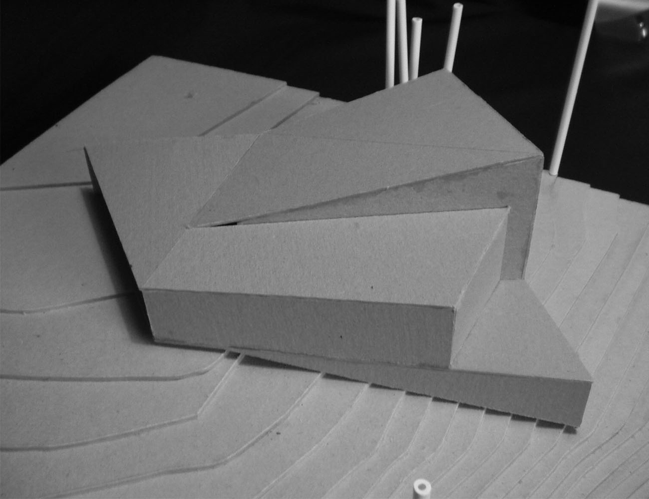 The blankness of the exterior is continued internally in the “public” spaces, furthering the idea of an uncanny container-like object in lieu of any semblance towards the “domestic”. The interior is in fact another exterior and equally “blunt” albeit the external tough metal cladding is replaced with a homogeneous ‘white’ surface. A crumpled ceiling expresses the force of the real (human arrival) and unreal (latent landscape line between mountain and view) vectors pushing in through the container-like internal space and fusing in to a singular projection to the distant water view; the ceiling profile relaxes as it approaches the culminating end space from where the views are experienced, similar to the effect of smoke travelling through a wind tunnel.