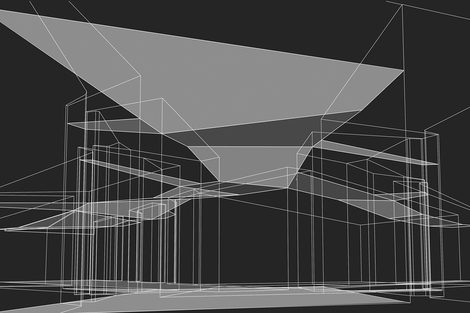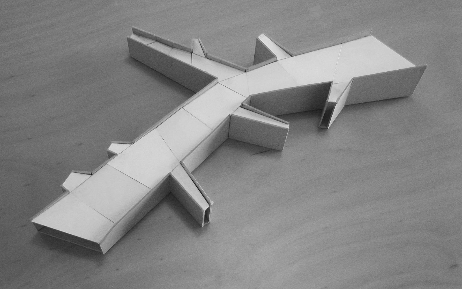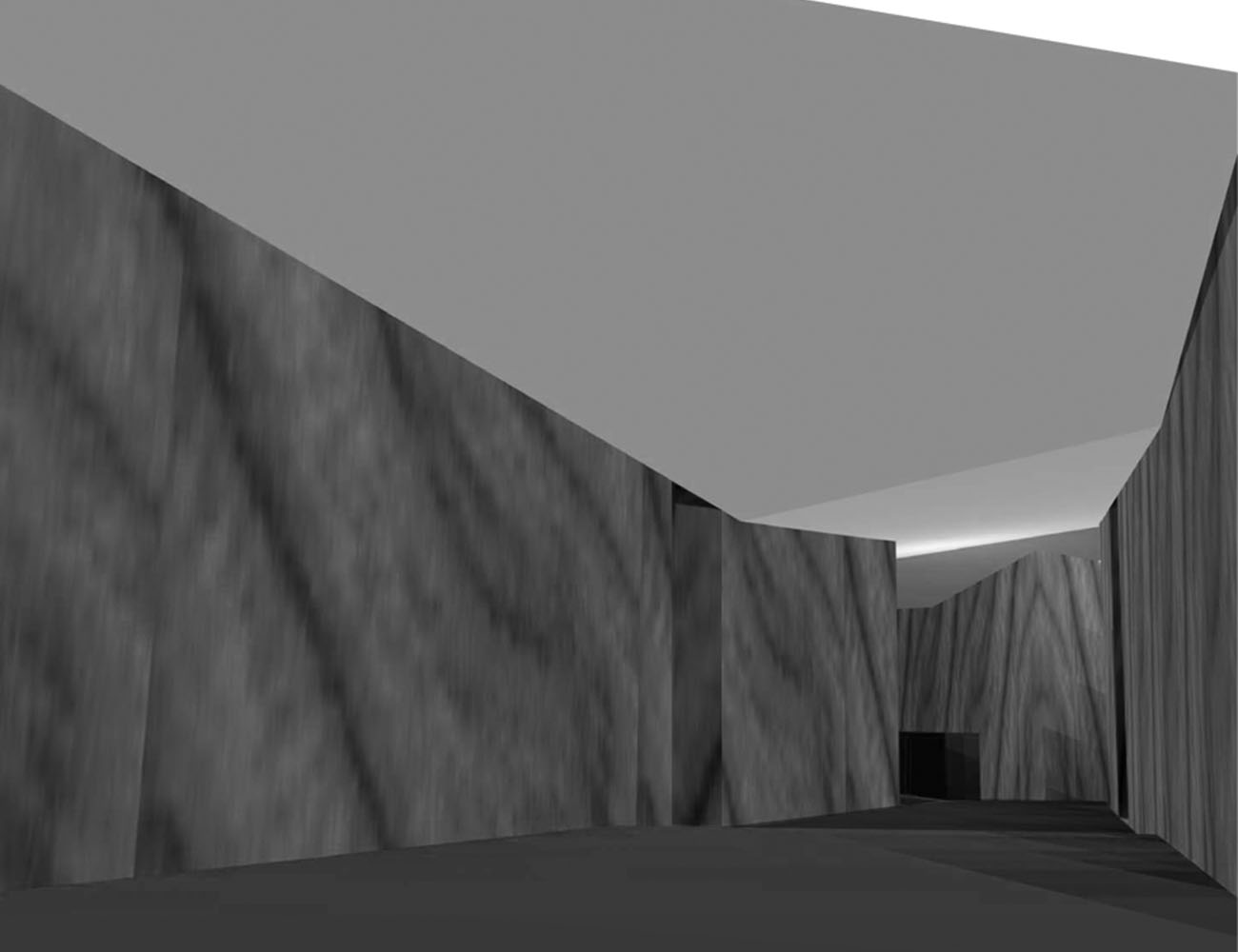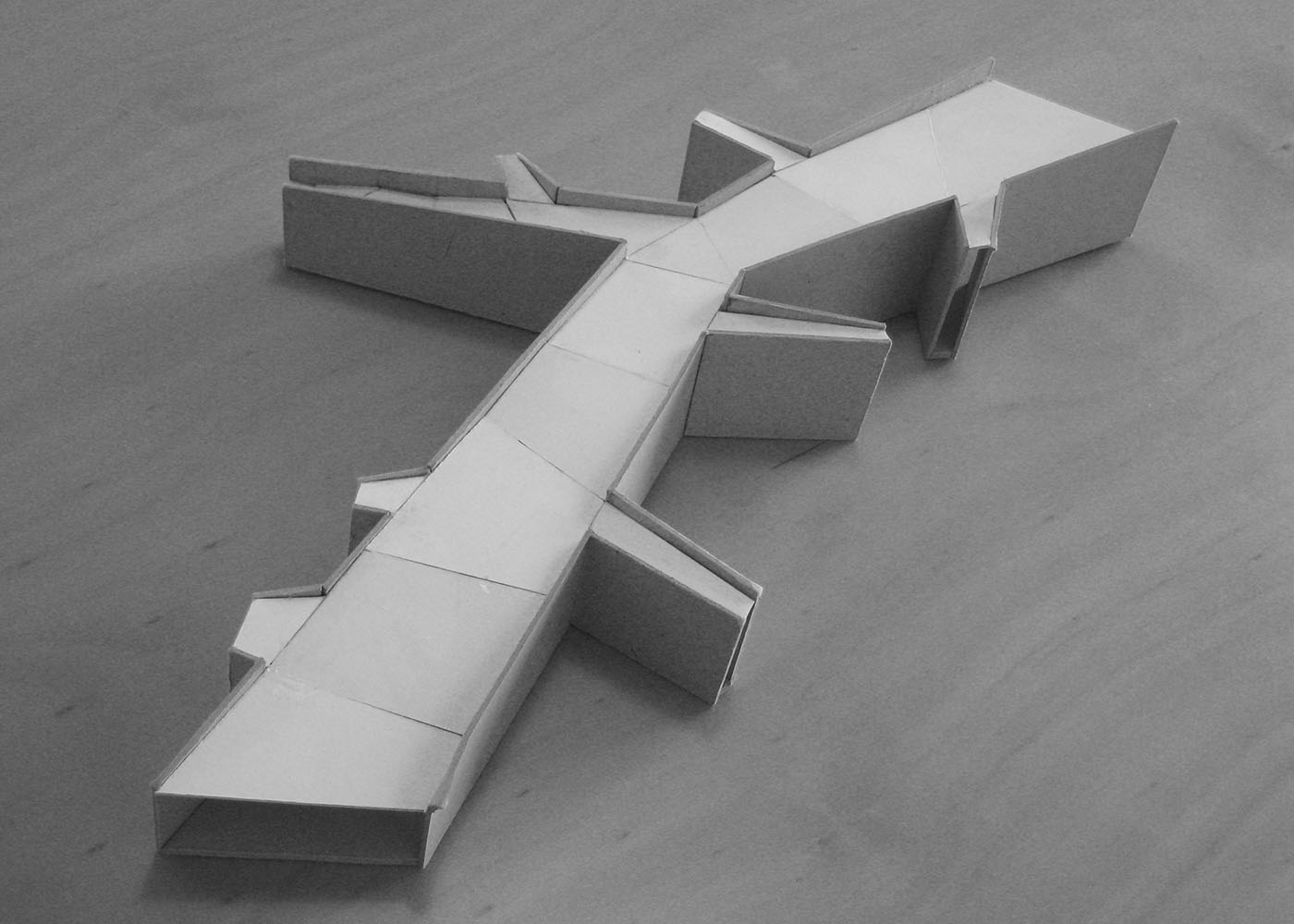 The blankness of the exterior is continued internally in the “public” spaces, furthering the idea of an uncanny container-like object in lieu of any semblance towards the “domestic”. The interior is in fact another exterior and equally “blunt” albeit the external tough metal cladding is replaced with a homogeneous ‘white’ surface. A crumpled ceiling expresses the force of the real (human arrival) and unreal (latent landscape line between mountain and view) vectors pushing in through the container-like internal space and fusing in to a singular projection to the distant water view; the ceiling profile relaxes as it approaches the culminating end space from where the views are experienced, similar to the effect of smoke travelling through a wind tunnel.