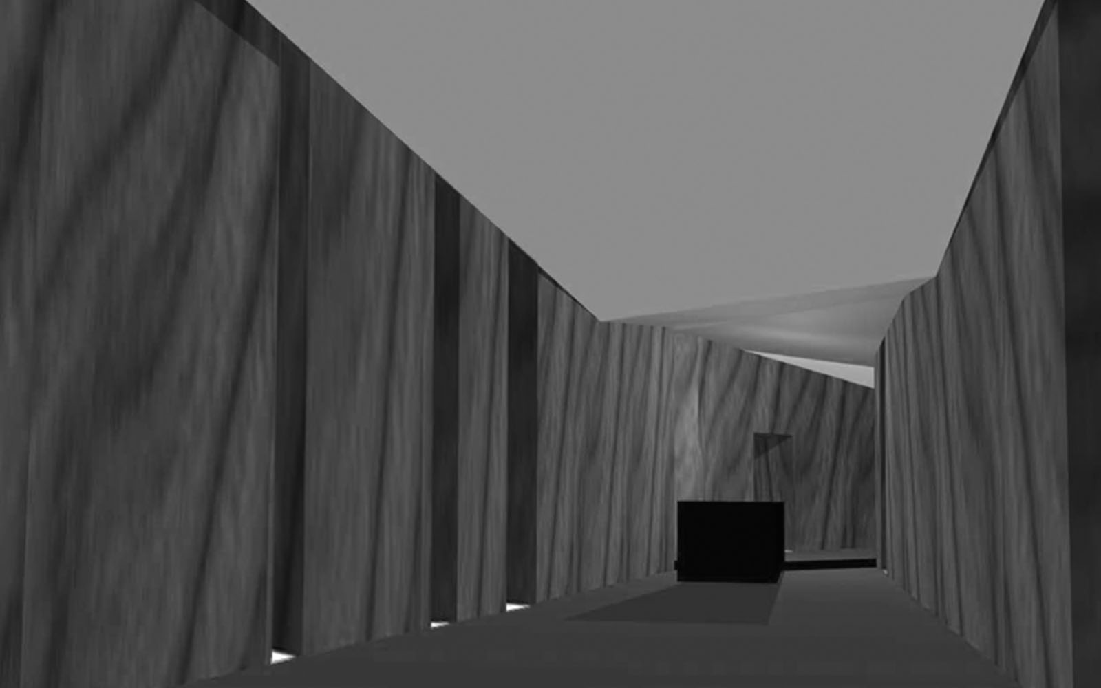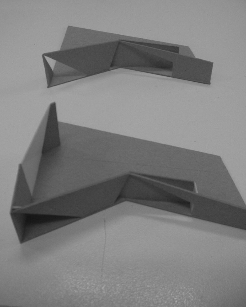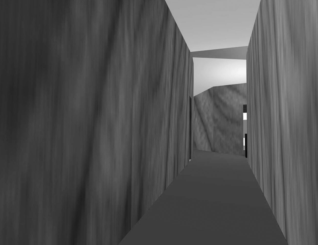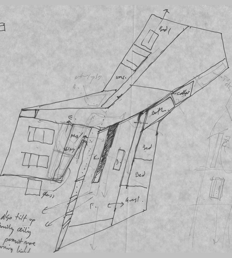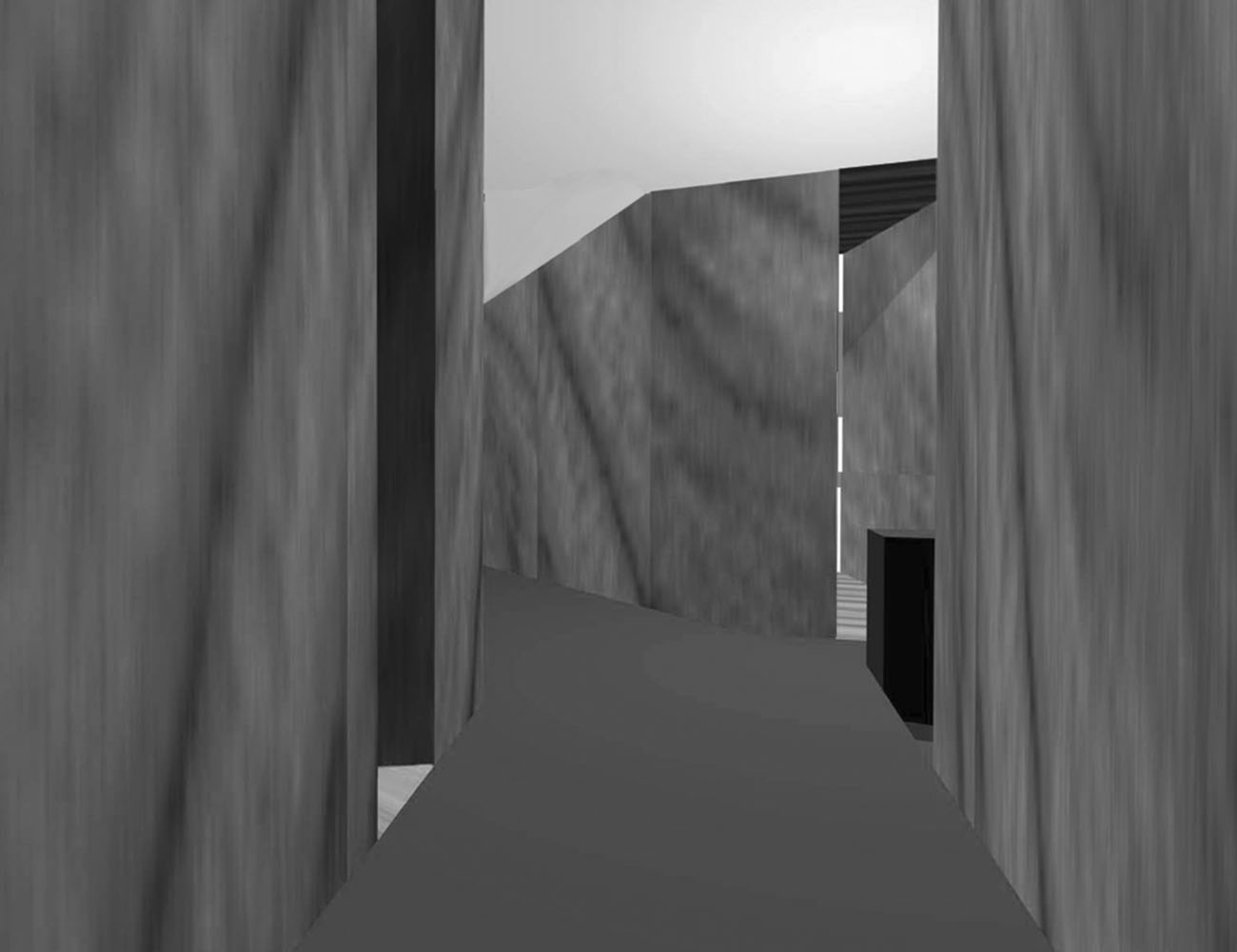 The blankness of the exterior is continued internally in the “public” spaces, furthering the idea of an uncanny container-like object in lieu of any semblance towards the “domestic”. The interior is in fact another exterior and equally “blunt” albeit the external tough metal cladding is replaced with a homogeneous ‘white’ surface. A crumpled ceiling expresses the force of the real (human arrival) and unreal (latent landscape line between mountain and view) vectors pushing in through the container-like internal space and fusing in to a singular projection to the distant water view; the ceiling profile relaxes as it approaches the culminating end space from where the views are experienced, similar to the effect of smoke travelling through a wind tunnel.