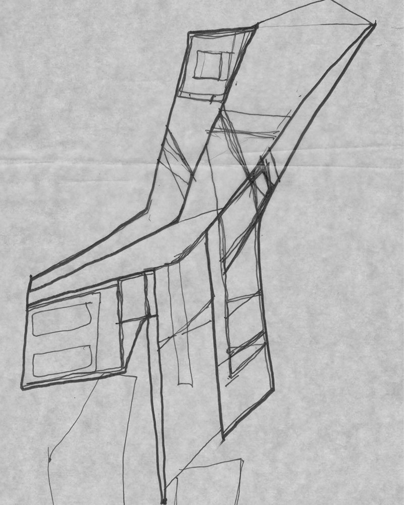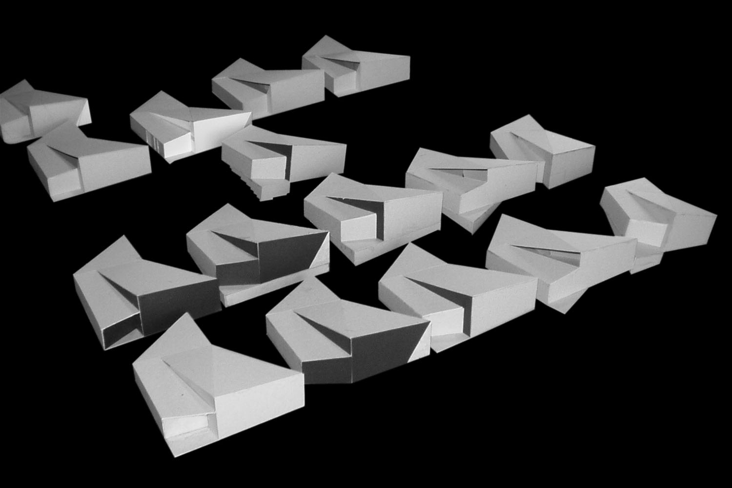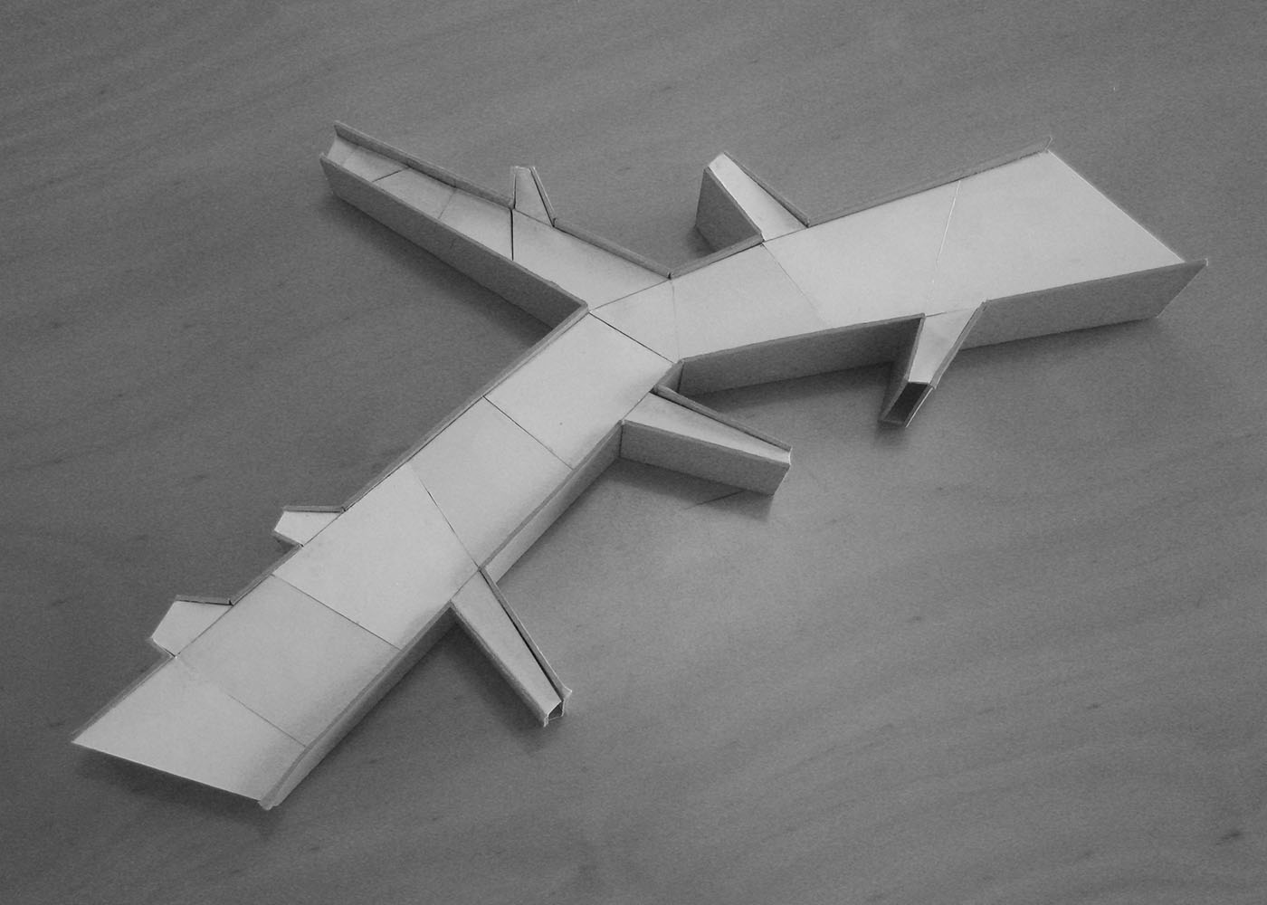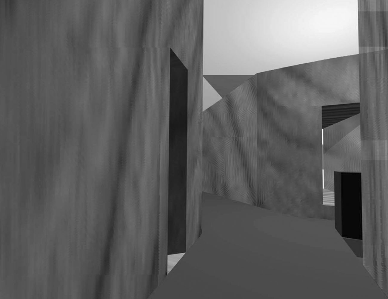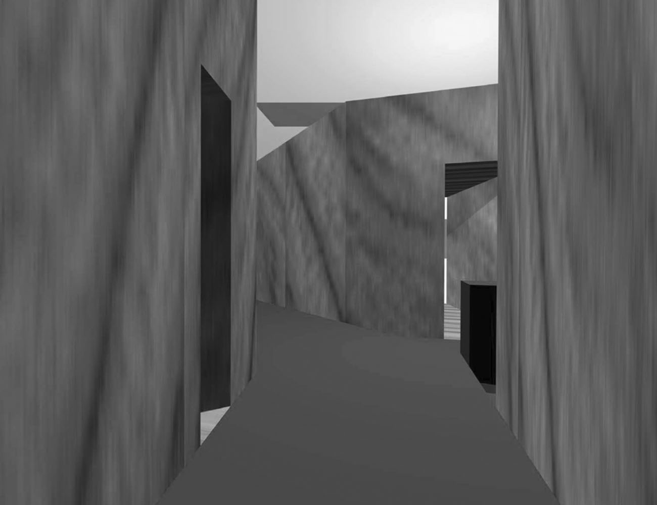 The blankness of the exterior is continued internally in the “public” spaces, furthering the idea of an uncanny container-like object in lieu of any semblance towards the “domestic”. The interior is in fact another exterior and equally “blunt” albeit the external tough metal cladding is replaced with a homogeneous ‘white’ surface. A crumpled ceiling expresses the force of the real (human arrival) and unreal (latent landscape line between mountain and view) vectors pushing in through the container-like internal space and fusing in to a singular projection to the distant water view; the ceiling profile relaxes as it approaches the culminating end space from where the views are experienced, similar to the effect of smoke travelling through a wind tunnel.