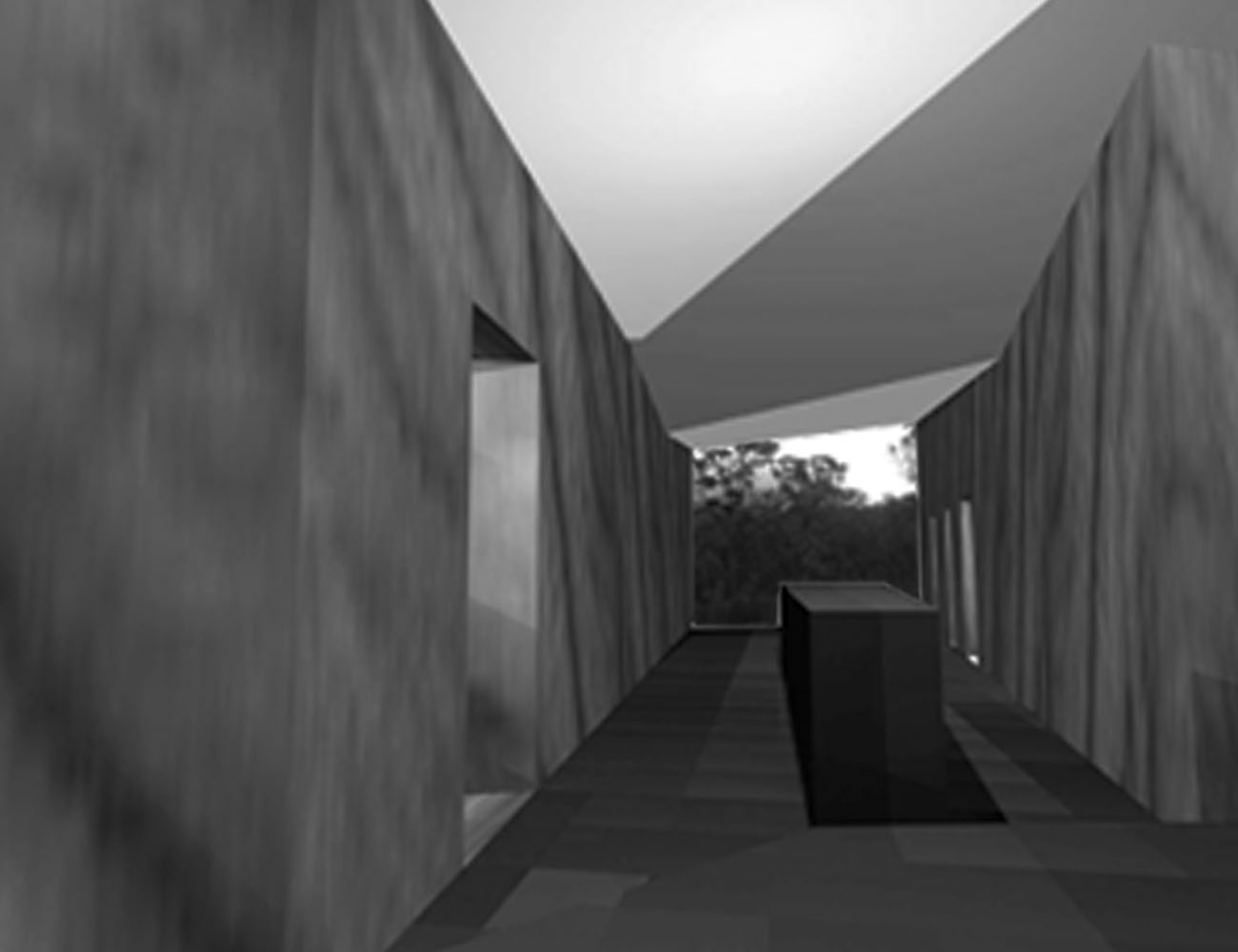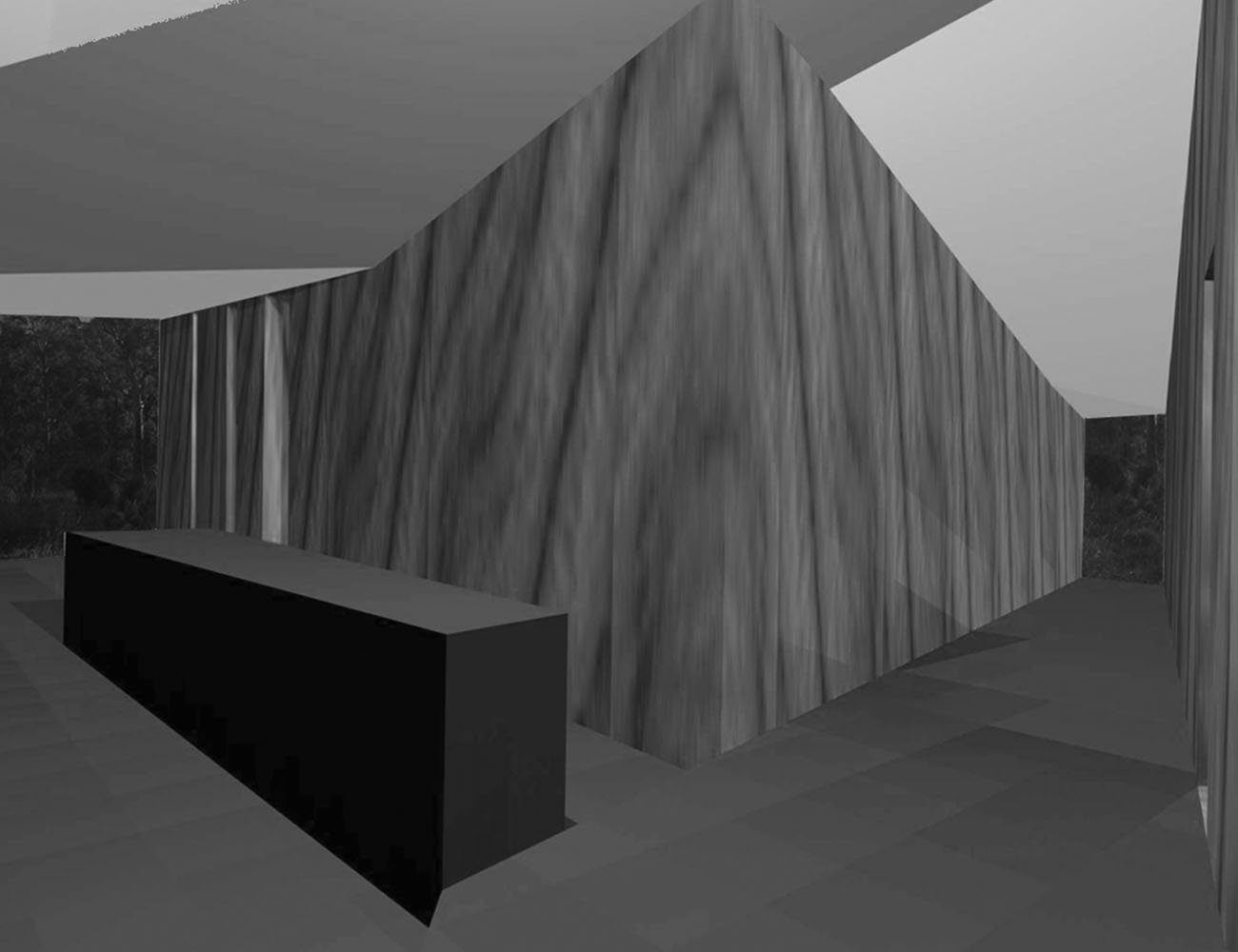 The winding and weaving nature of the approach road, along a rural dirt road through the landscape to the escarpment clearing, suggested an architectural response in the form of a line in the landscape as a continuation of previous investigations by the practice into the formal and spatial potential of a singular line in a powerful landscape setting. Here, a timber line runs parallel to the road and switches back and forth through the trees, gradually rising in height until it reaches a climax at the edge of the escarpment. Partway along this wall, its underbelly is eroded by a dark base (providing concealed entry doors) that alters in height. The only clues to habitation are small lancet windows toward the high end of the wall.