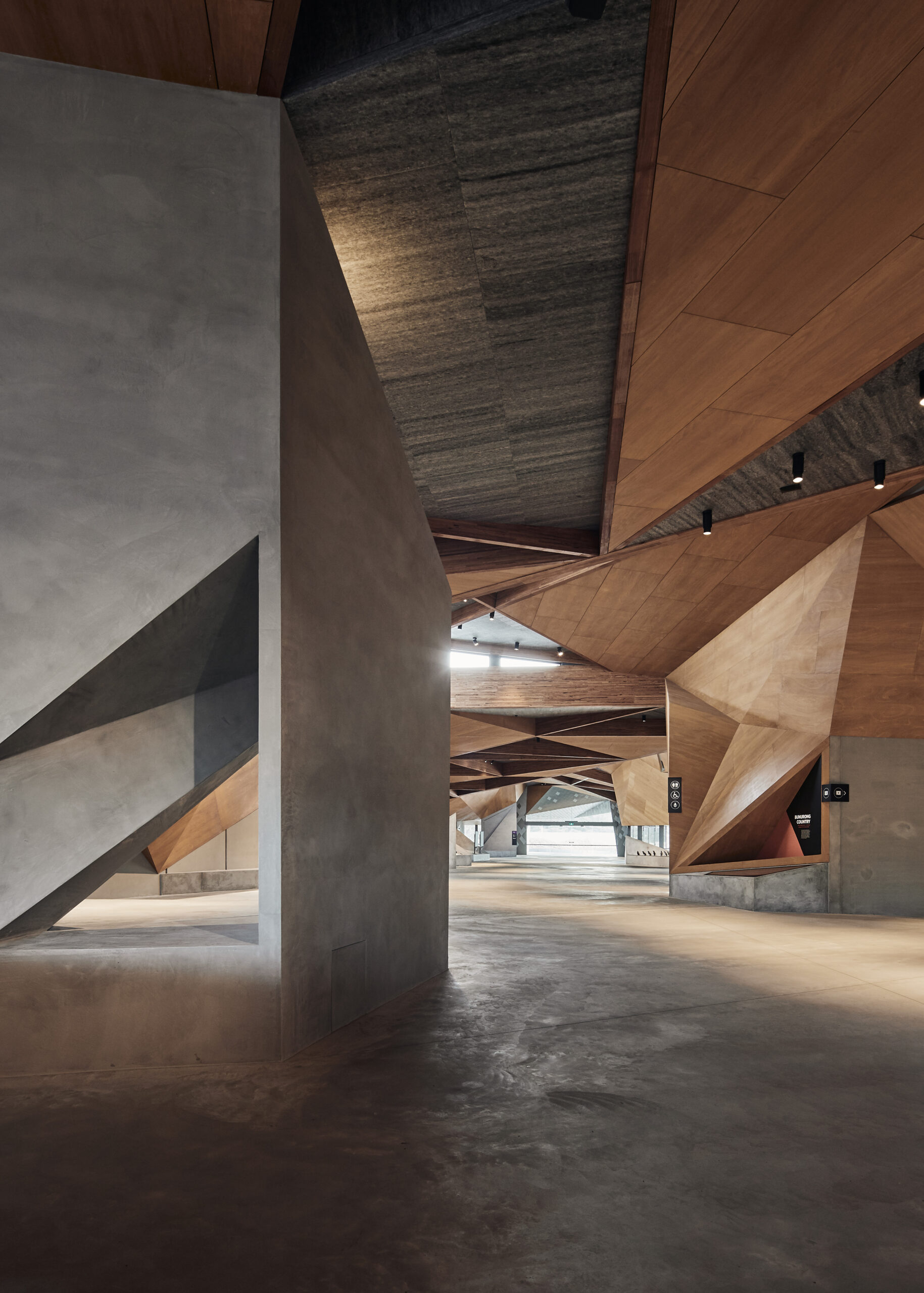 The Centre forms a nexus between the dunes, headland and wetland, linking all three delicate landscapes, while responding specifically to each, both formally and experientially. Clad externally in zinc, the weathering power of this rugged coast will in time etch itself onto the Centre’s abstract form. Splayed in different directions towards beach, headland and wetland, its tough, self-finishing outer shell is matched inside by exposed structural timbers lined with plywood.