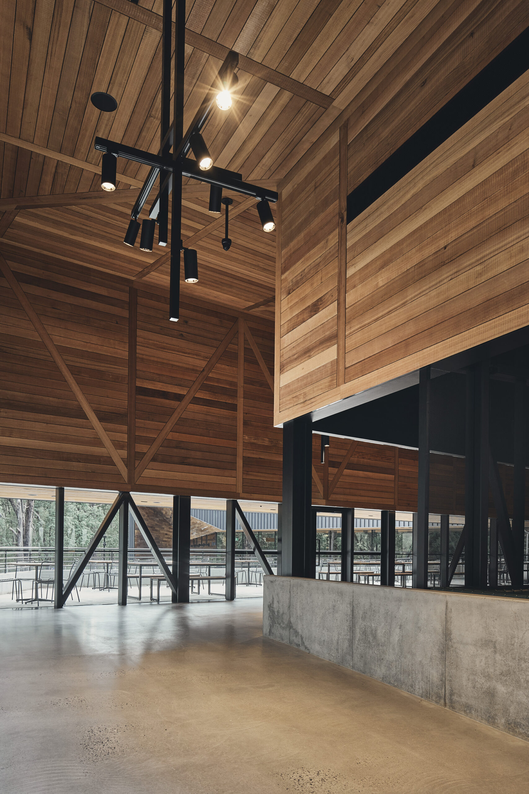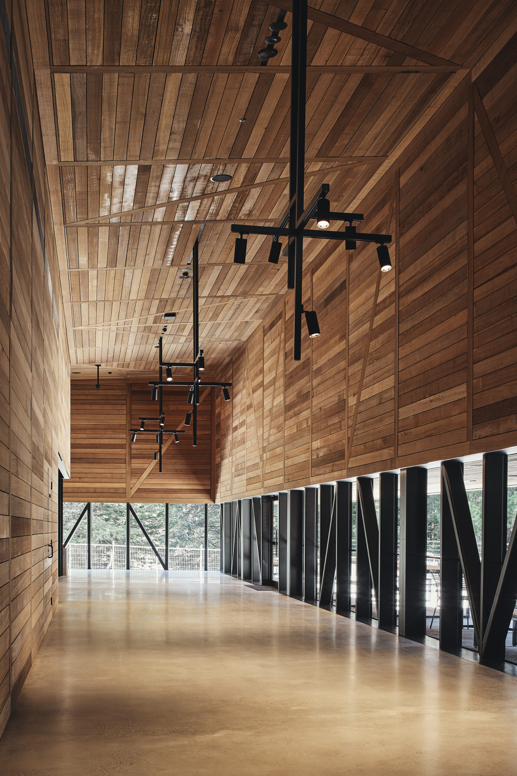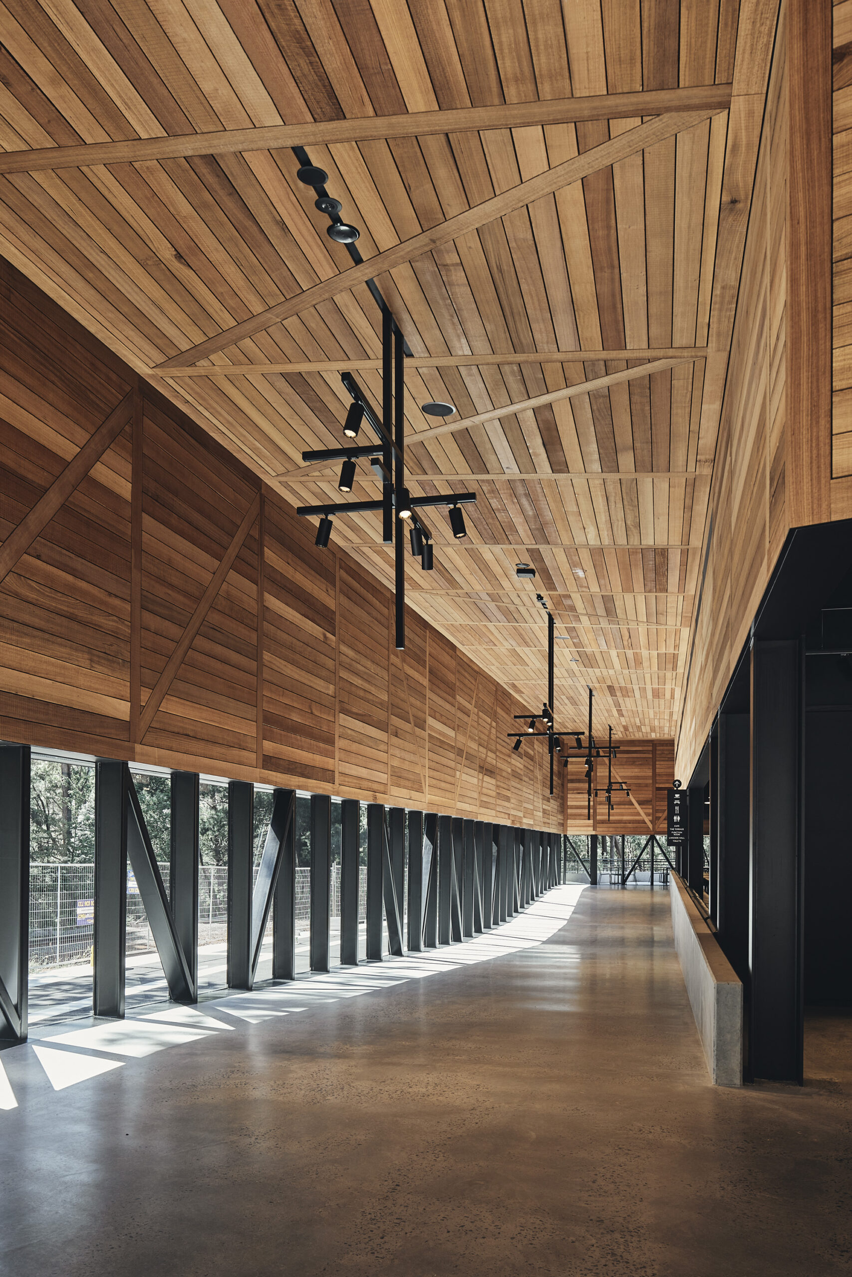Internal iconography: trestle bridge Discovery becomes the experience that ties everything together along and uninterrupted discovery space that is inspired bu the long winding trestle bridges that are so important for the Puffing Billy image and experience. This space structures a journey that constantly reveals the park and bush dimensions of Lakeside. A warm timber interior (recalling the bridges) houses a drastic train and local fauna installation along its entire length. The discovery space also becomes a meeting point between visitors and the many committed volunteers.