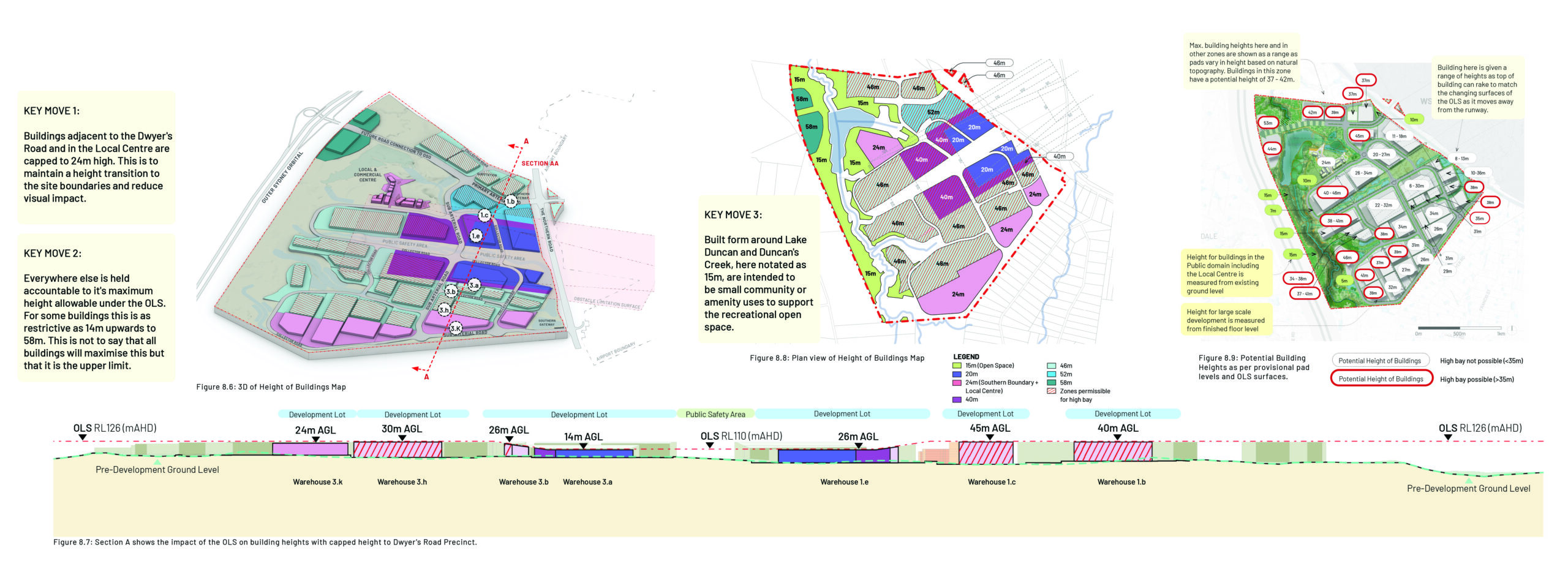 The strategic location of the site adjacent to the new airport led to its identification as a key part of any future logistics and support infrastructure. At the same time, the varied topography on site required negotiation to accommodate increasingly large industrial building footprints. There were also unique external controls such as height constraints due to the flight paths of approaching aircraft.