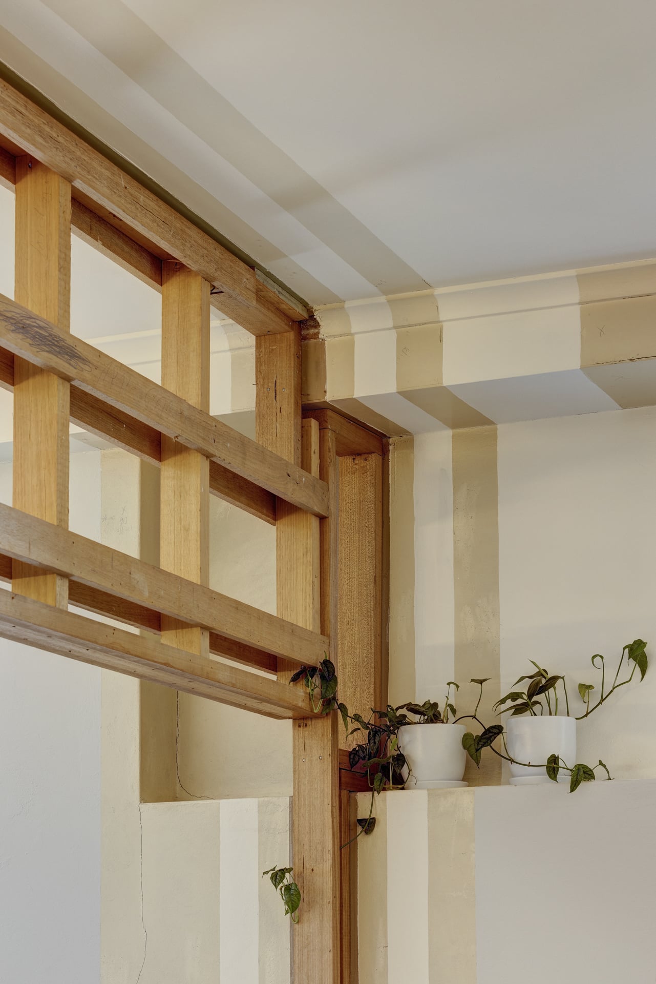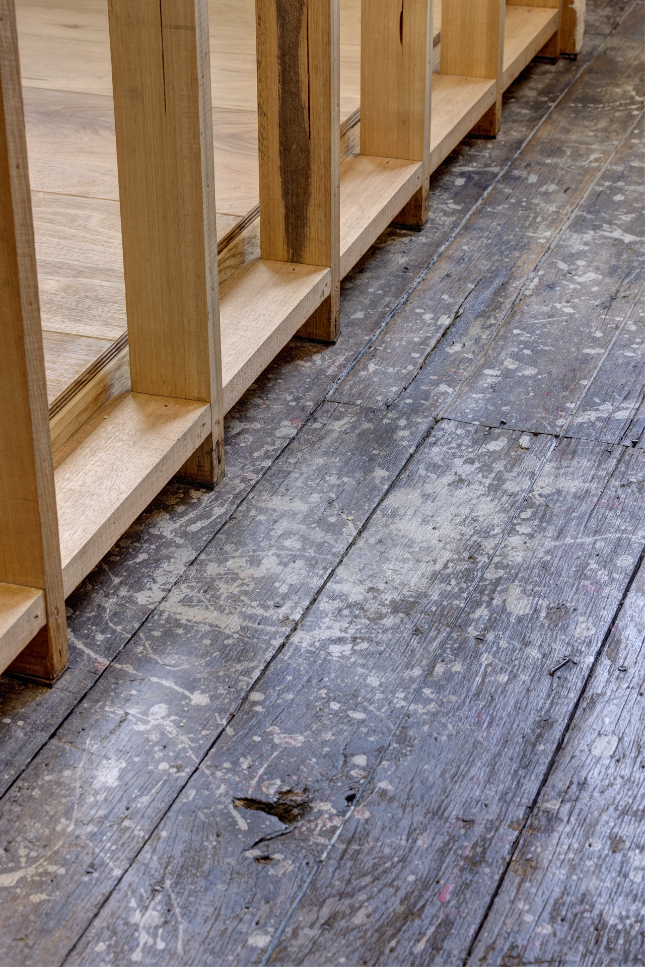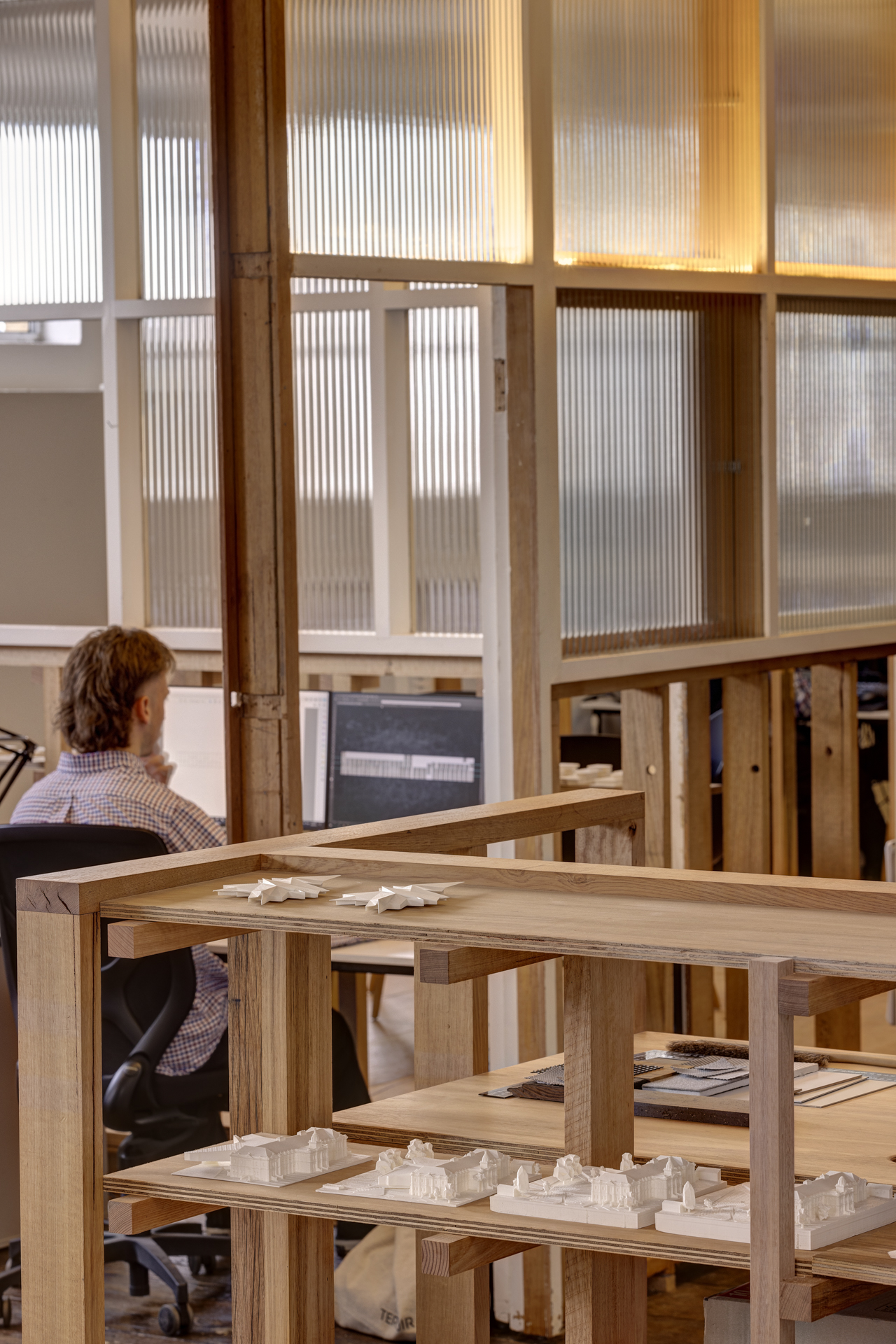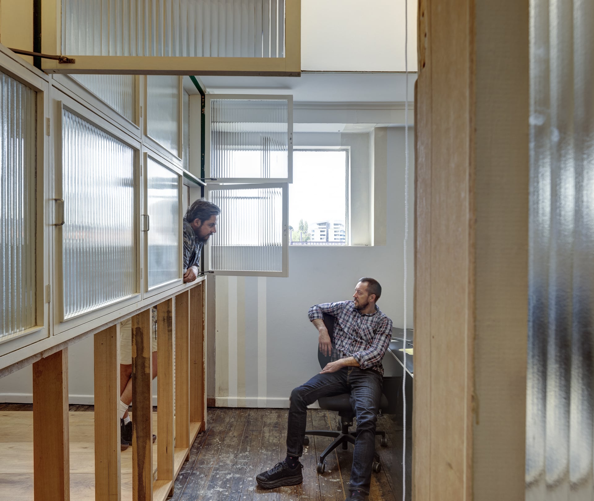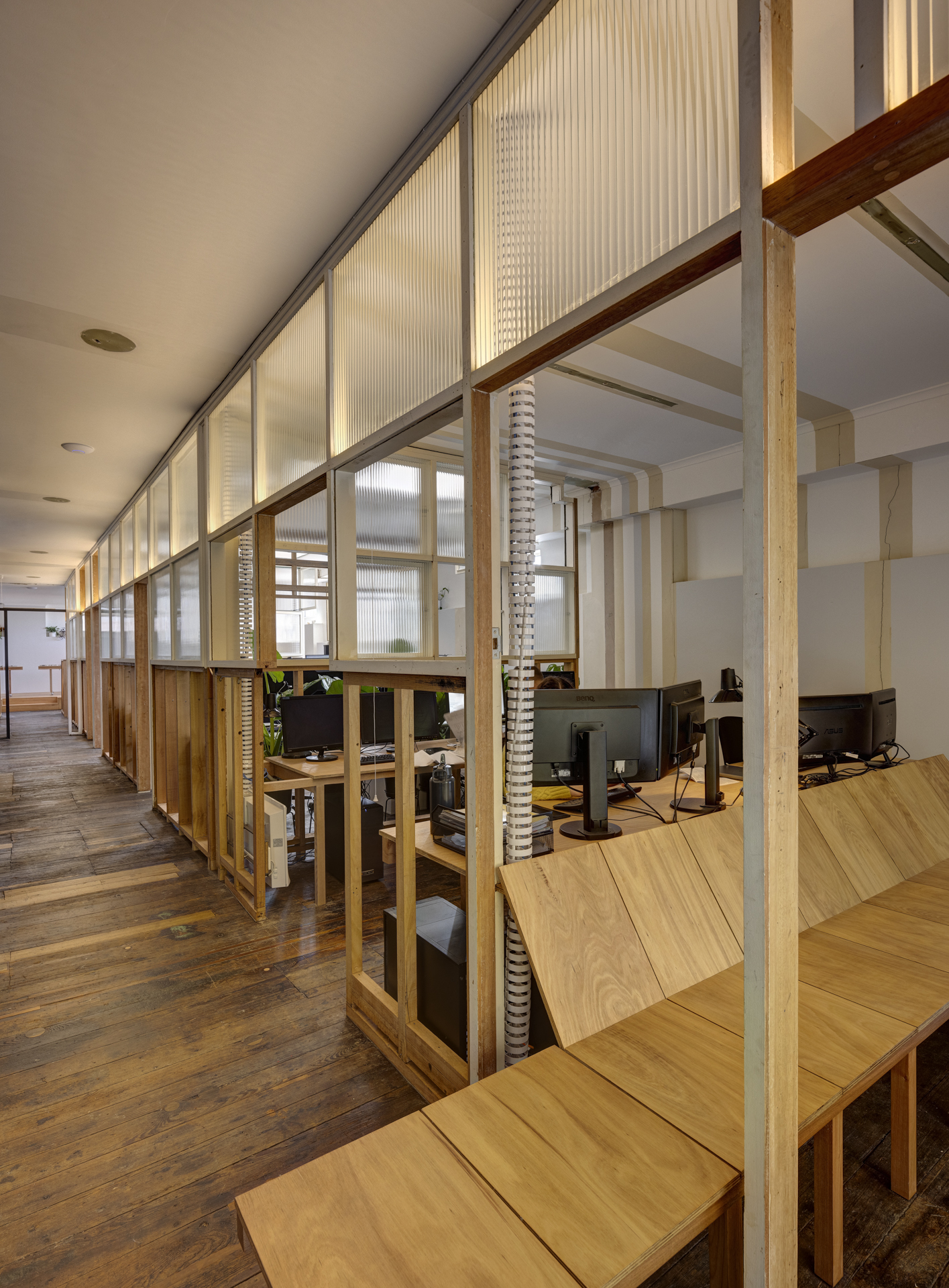 The entire fitout is a cannibalisation of what was already there. The old wall finishes were removed, revealing beautiful 1960s framework carpentry, and a series if glazed partition and windows. All were removed and reassembled into a new configuration. New shelving was made from residual waste. Only the cabling for power and internet was new. The resulting spaces and office organisation is a result of accepting these constraints, with a wit and humour in the peek holes and cubby holes adding new character to how we work compared to our old open plan configuration.