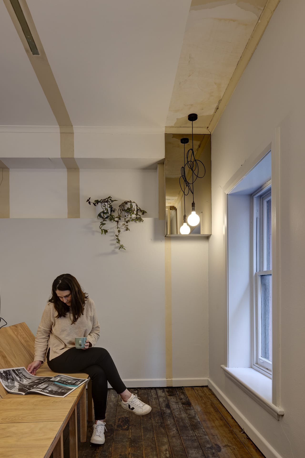 This project, for TERROIR’s own office in Hobart, Tasmania, is an experiment that challenges the paradox of “sustainable architecture”. Occupying a space with an abandoned office fit out from the 1960s, all previous partitions were still in place when we arrived. Given this, we took a conceptual decision to sidestep the various carbon calculators and claims for low carbon by instead simply emitting zero carbon – by building nothing new at all.