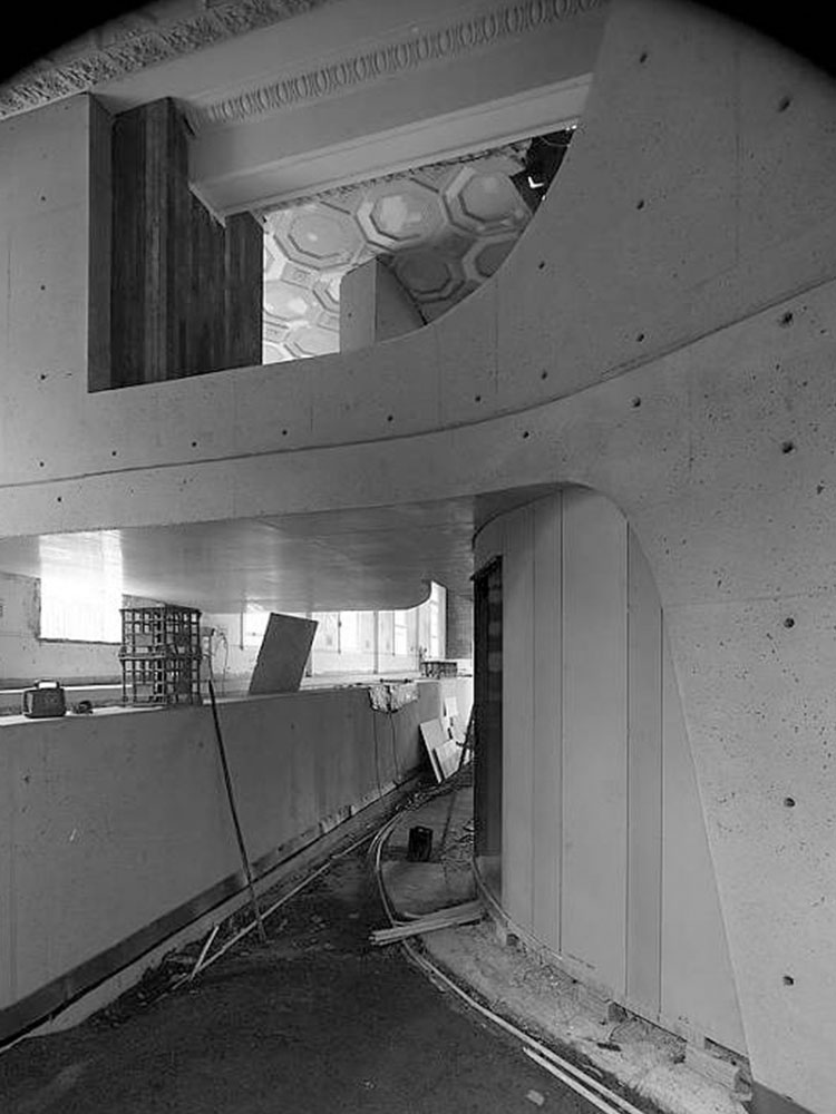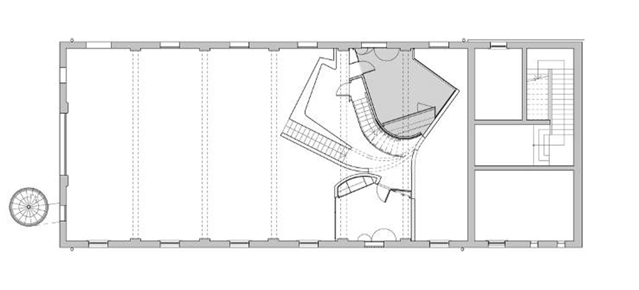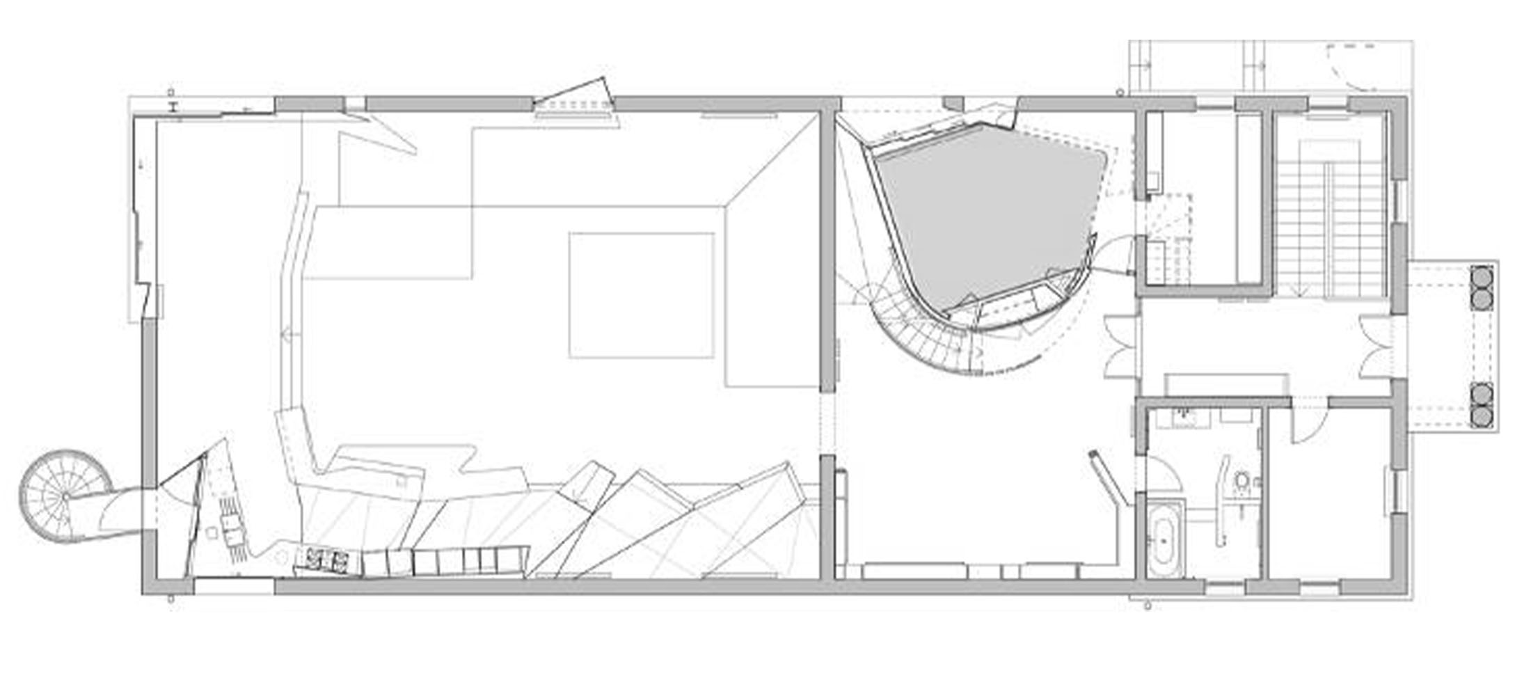 The new occupation of this building in a residential mode significantly changes both the pattern and type of use of the site. The landscape is gathered up into a vortex that presses into the building, while inside, a series of nested spaces address issues of scale and occupation. These interiors operate like Russian dolls, or alternately the finely tailored clothing worn by the client, with interior linings that speak of an alternate exterior. As with this clothing, the insertions into the existing building take the occupant further and further into an embedded interior until, in a moment of unexpectedness, they press against the exterior and break through to the garden.