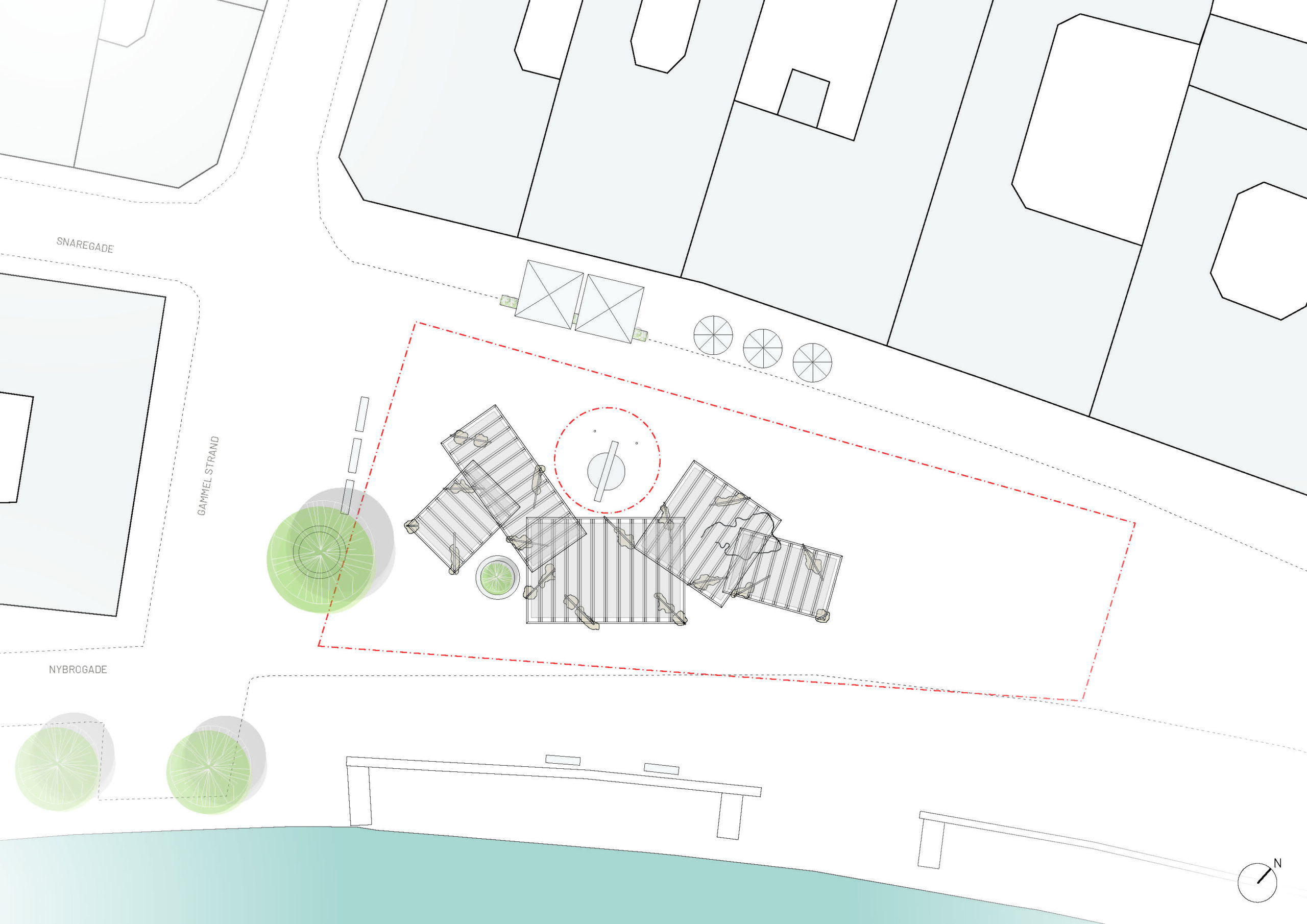 Design for disassembly requires generic geometries and elements, without which claims for re-use become only theoretical but unlike to be implemented. At the time, specific sites require specific solutions. We found the answer in the design of five different rectangles, of different sizes, that together have been arranged to account for the high amount of circulation around and through Gammelstrand where it was first located. At the same time, the different rectangles can be re-arranged in anew ways on other sites. Anchoring the rectangular frames in 3D printed feet allows for different levels in the different locations. At any point, the whole project can be disassembled and stored as a series of elements until needed again.