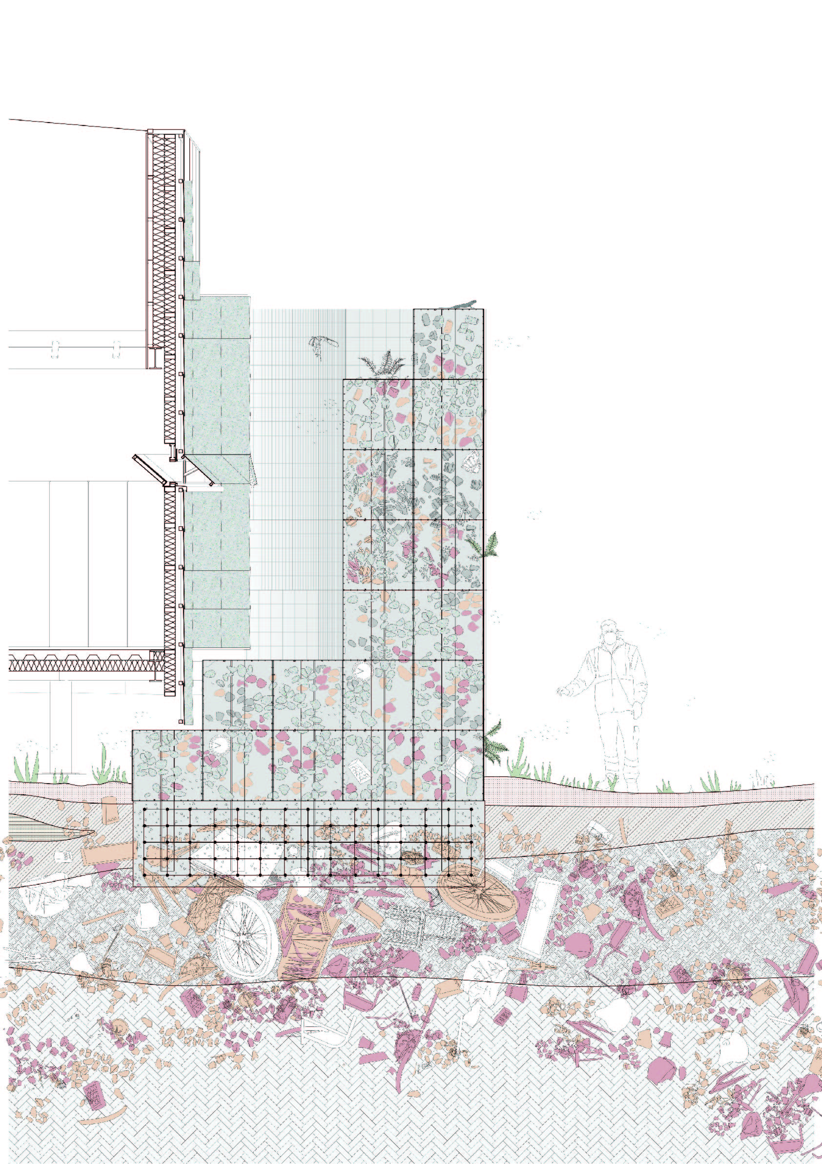 Understanding this, the design team set out to produce a building composes exclusively of materials that were re-used, recycled or upcycled. In this way, all forms of material optimisation are on display, literally, in the making of building itself. With its gabion walls of various waste materials, recycled timber structures, upcycled ceramic façade panels and so on, the building is a living exemplar of the options available. At the same time, the landscape – denuded after years of waste burial below – is gradually bought back to life through a landscape strategy focused on phytoremediation.