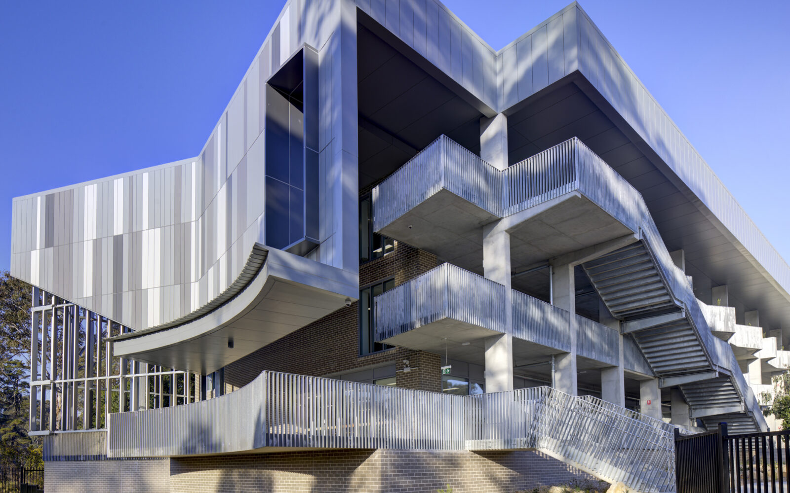 A philosophy of student-centred learning underpins the internal planning, a series of loose fit spaces strung along the spine and with distinct front and back aspects. To the west, a more closed façade enables smaller study areas and associated infrastructure while to the east, a porous façade and circulation system maximises student interactions with each other and the landscape – a significant part of the project in both pedagogic and biodiversity terms. Structuring the relation to this landscape is a small one-story building containing a range of specialist functions while the land project itself – working with indigenous partners and landscape practice REALMstudios – restores indigenous logics at a time when more of the extant landscape in this part of Sydney is being lost.